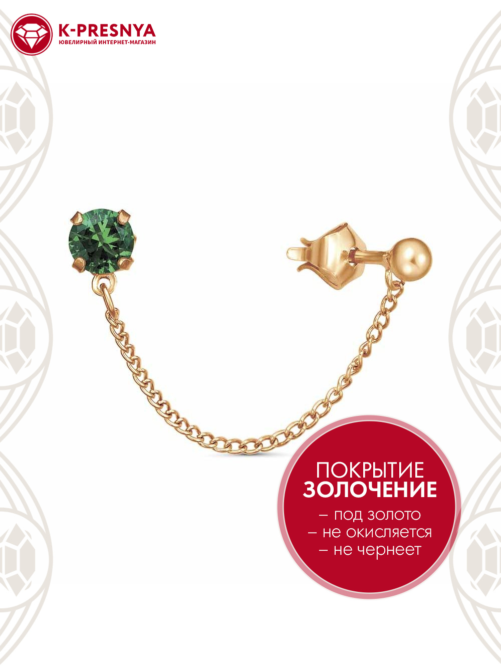 Серьга бижутерия, покрытие - золочение, вставка - искусственная шпинель