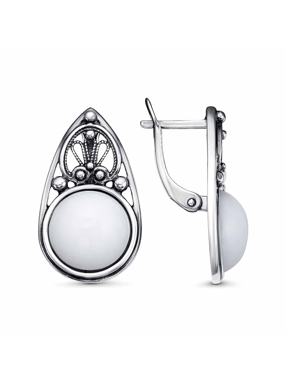 Серьги бижутерия, покрытие - серебрение с оксидированием, вставка - искусственный агат белый