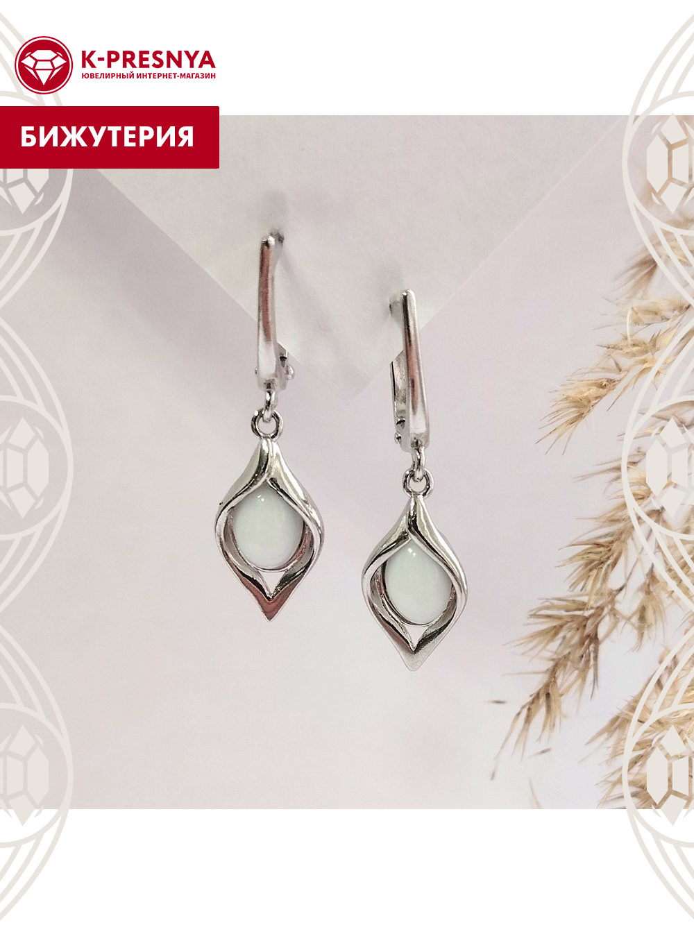 Серьги бижутерия, покрытие - платинирование, вставка - искусственный агат белый