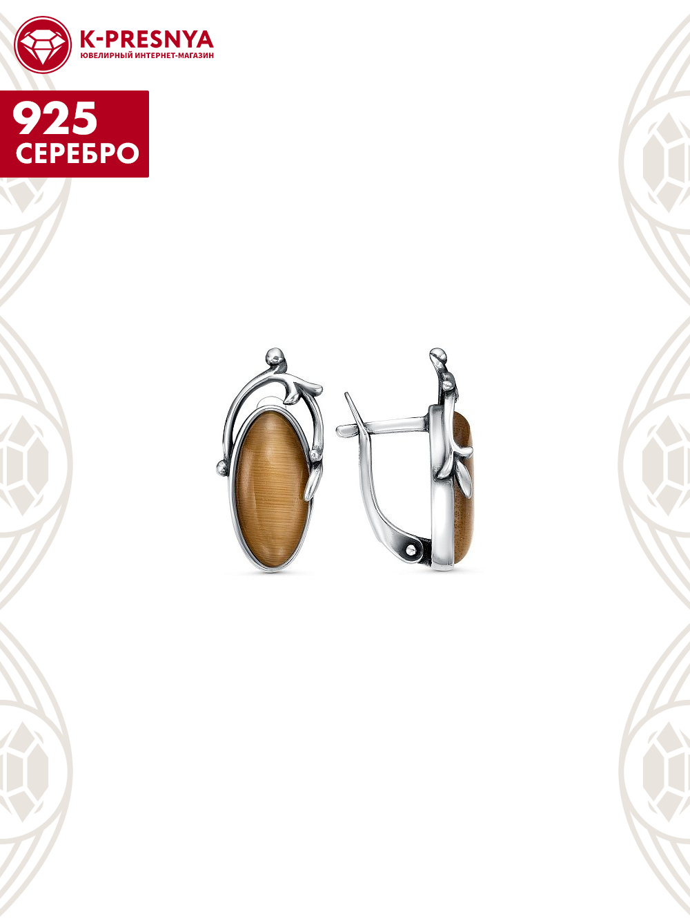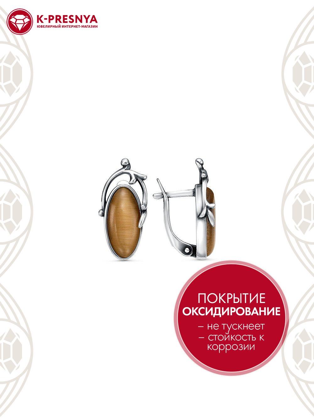 Серьги серебро 925 пробы, покрытие - оксидирование, вставка - искусственный кошачий глаз
