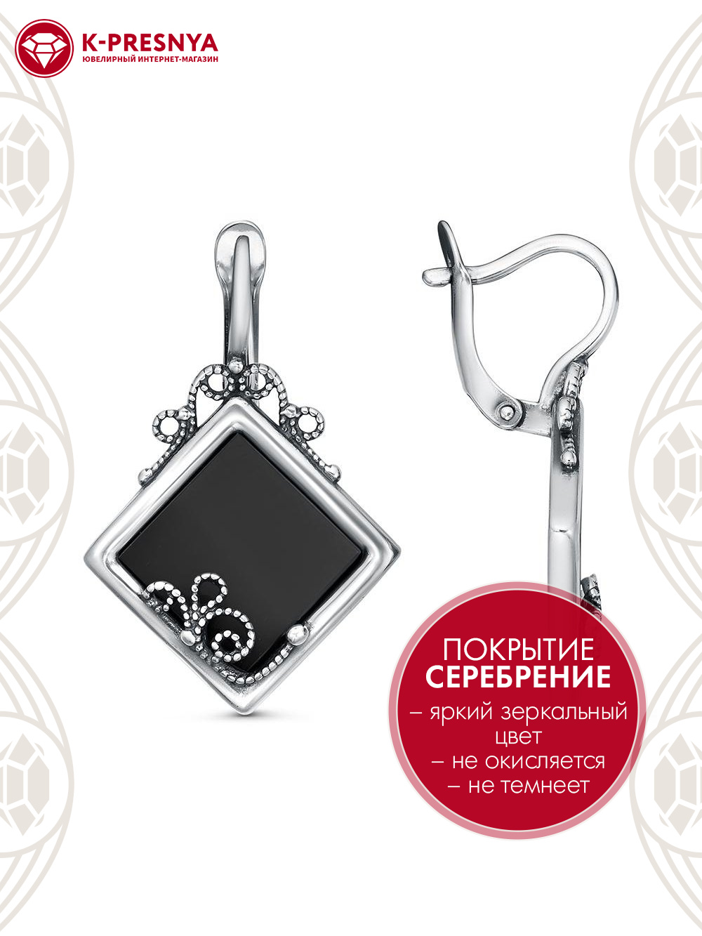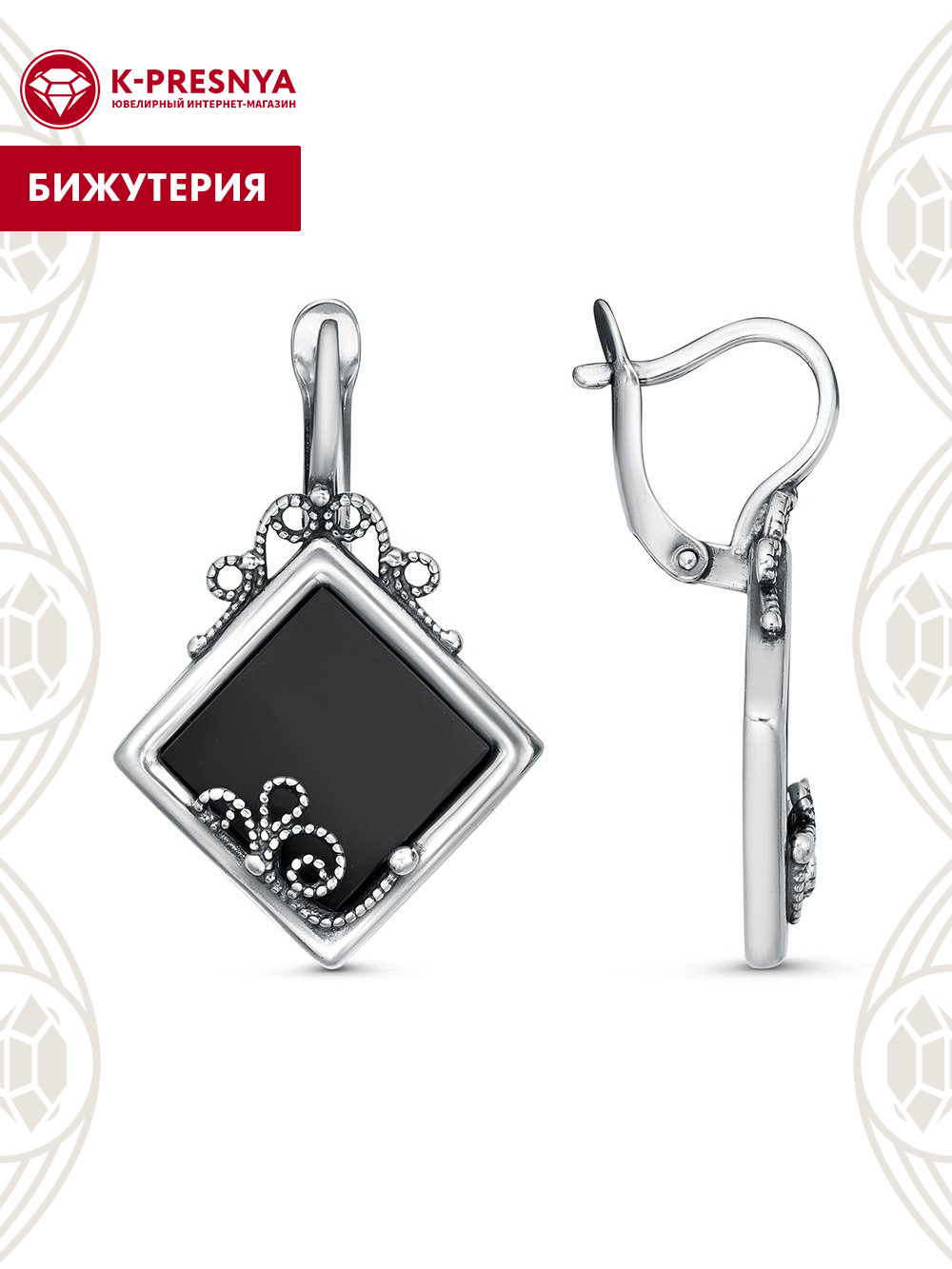 Серьги бижутерия, покрытие - серебрение с оксидированием, вставка - искусственный агат черный