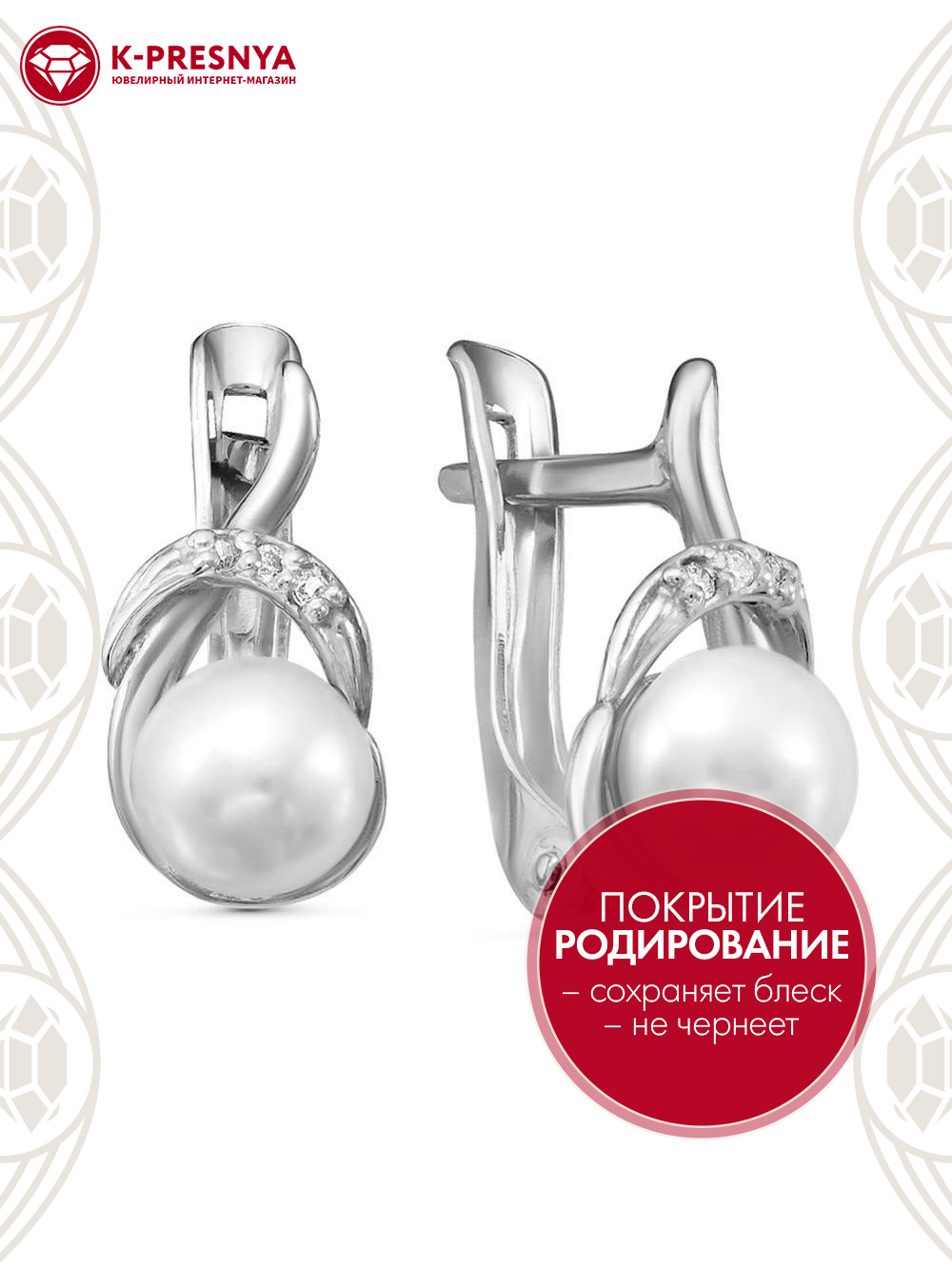 Серьги серебро 925 пробы, покрытие - родирование, вставка - культивированный жемчуг, фианит (недрагоценный камень)