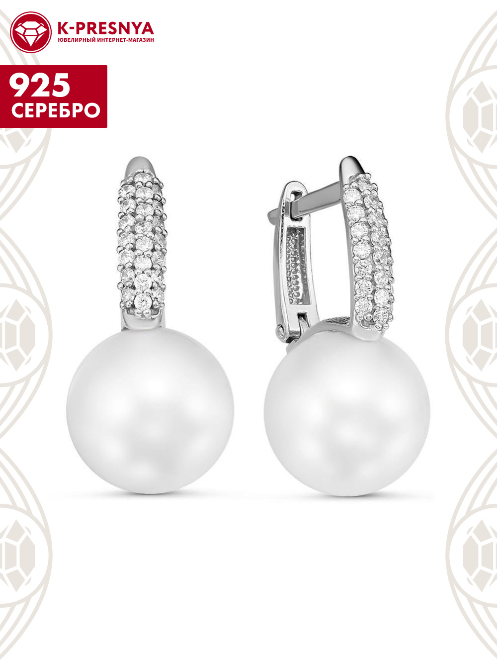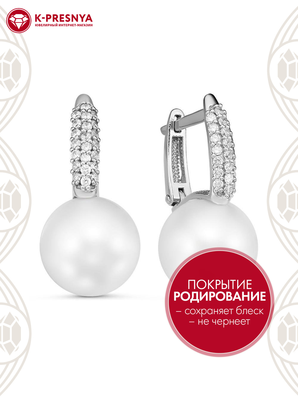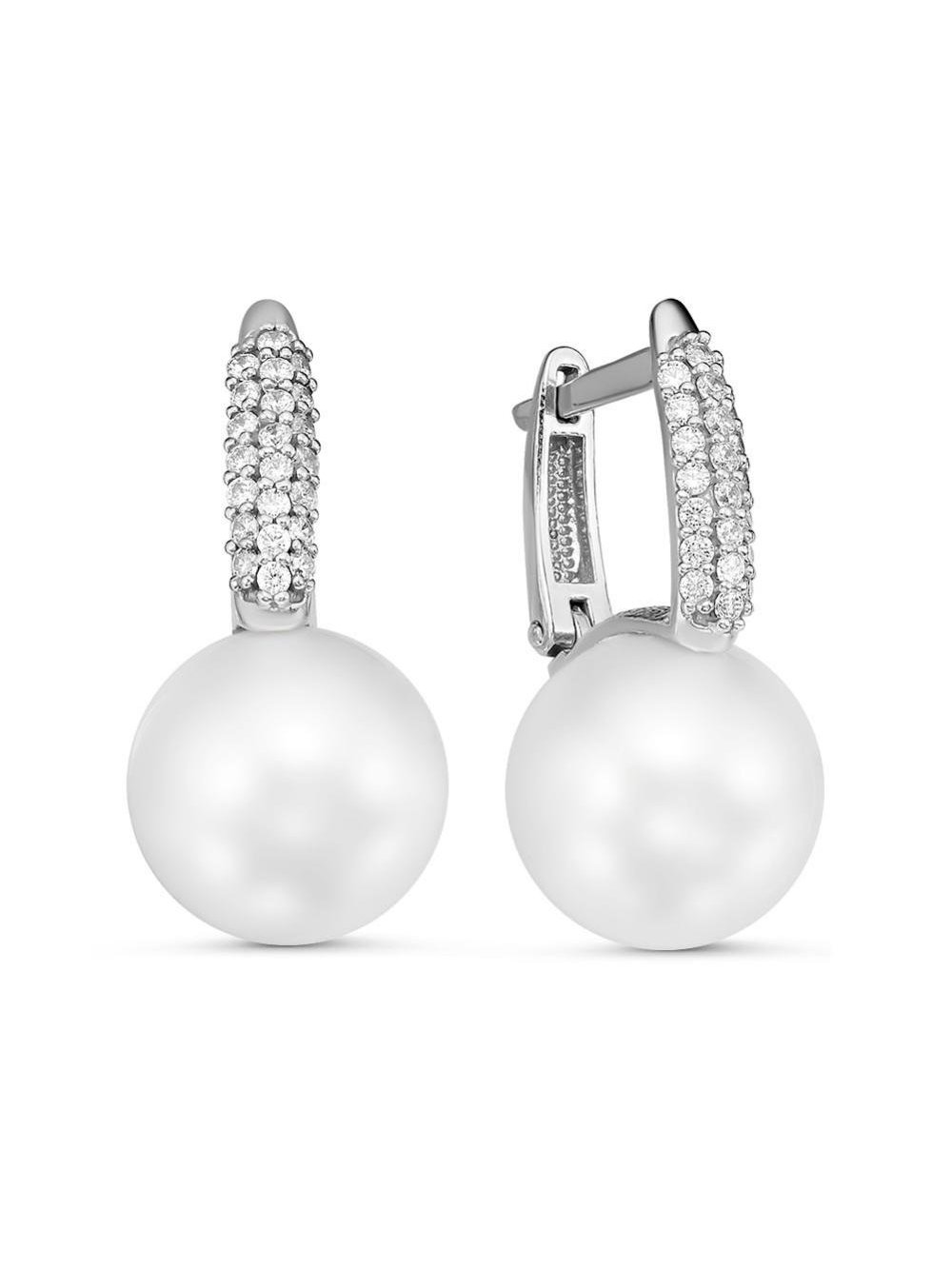 Серьги серебро 925 пробы, покрытие - родирование, вставка - имитация жемчуга, фианит (недрагоценный камень)