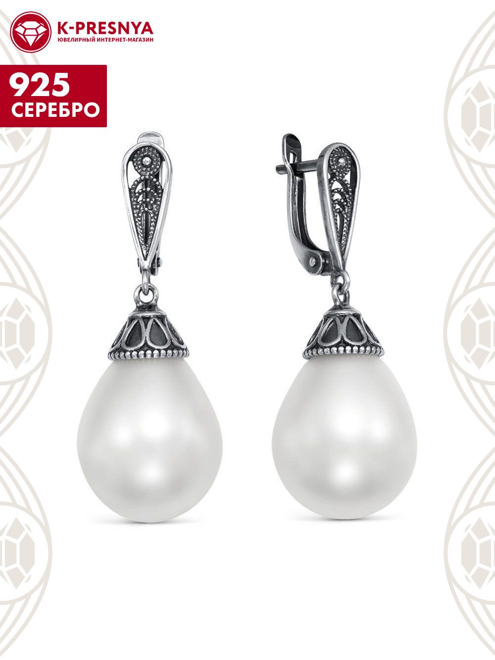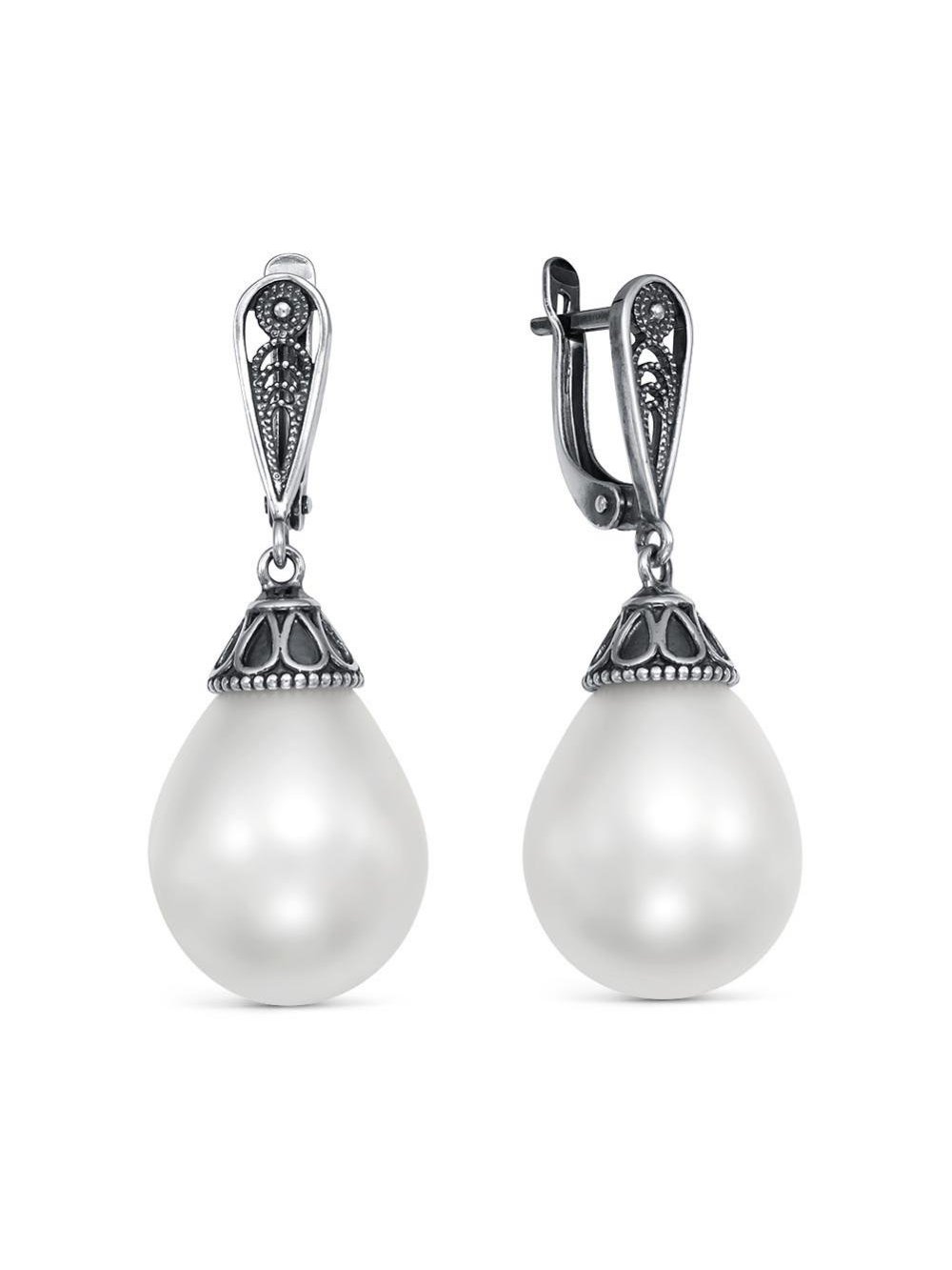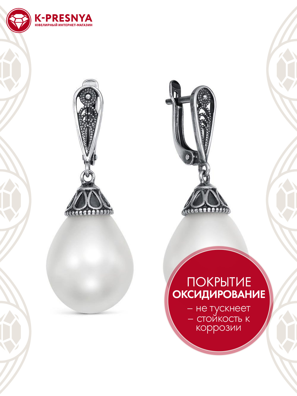 Серьги серебро 925 пробы, покрытие - оксидирование, вставка - имитация жемчуга