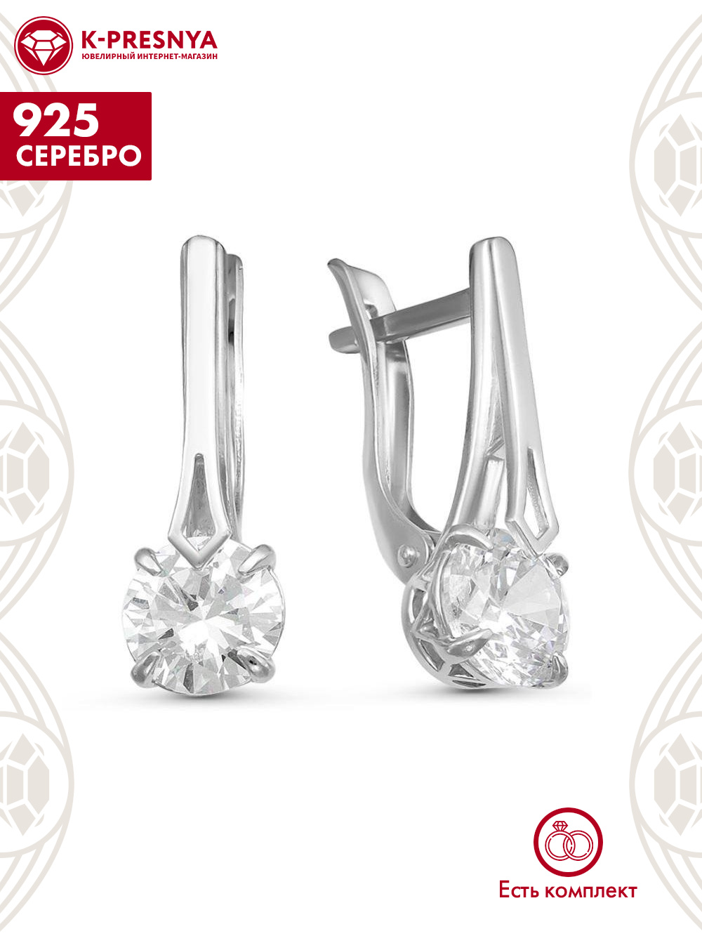 Серьги серебро 925 пробы, покрытие - родирование, вставка - фианит (недрагоценный камень)