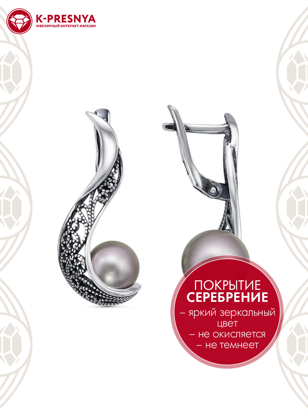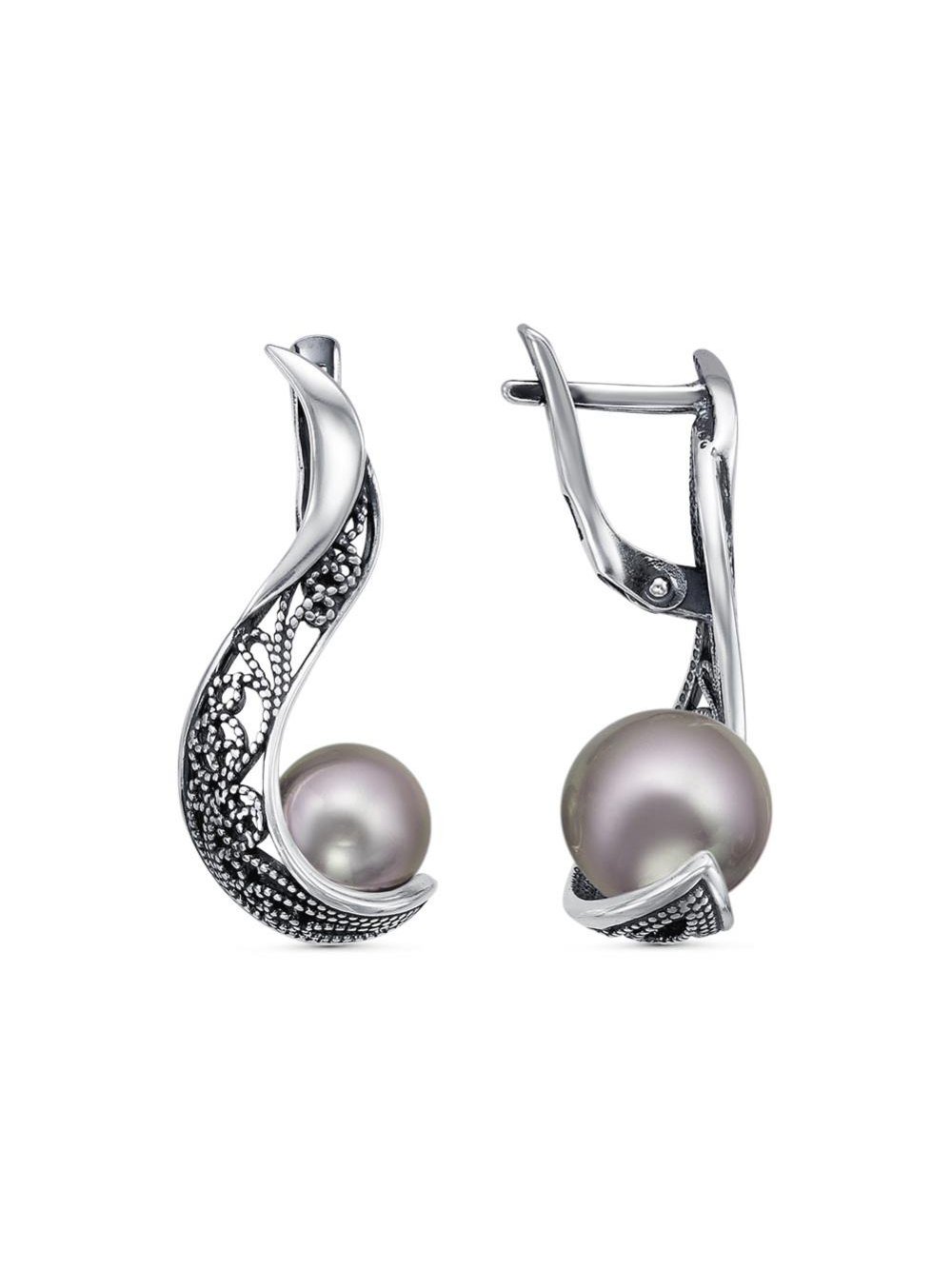 Серьги бижутерия, покрытие - серебрение с оксидированием, вставка - имитация жемчуга