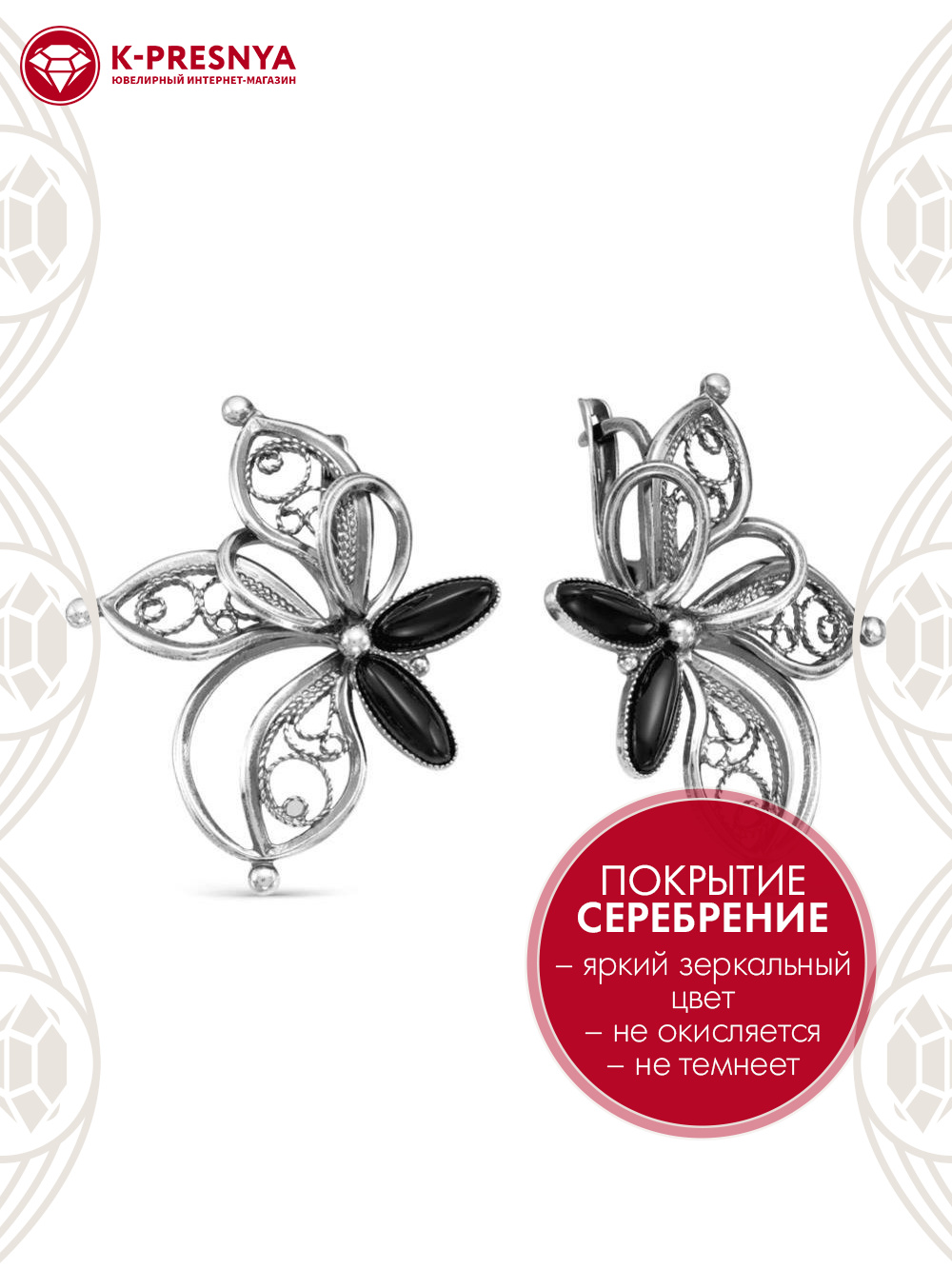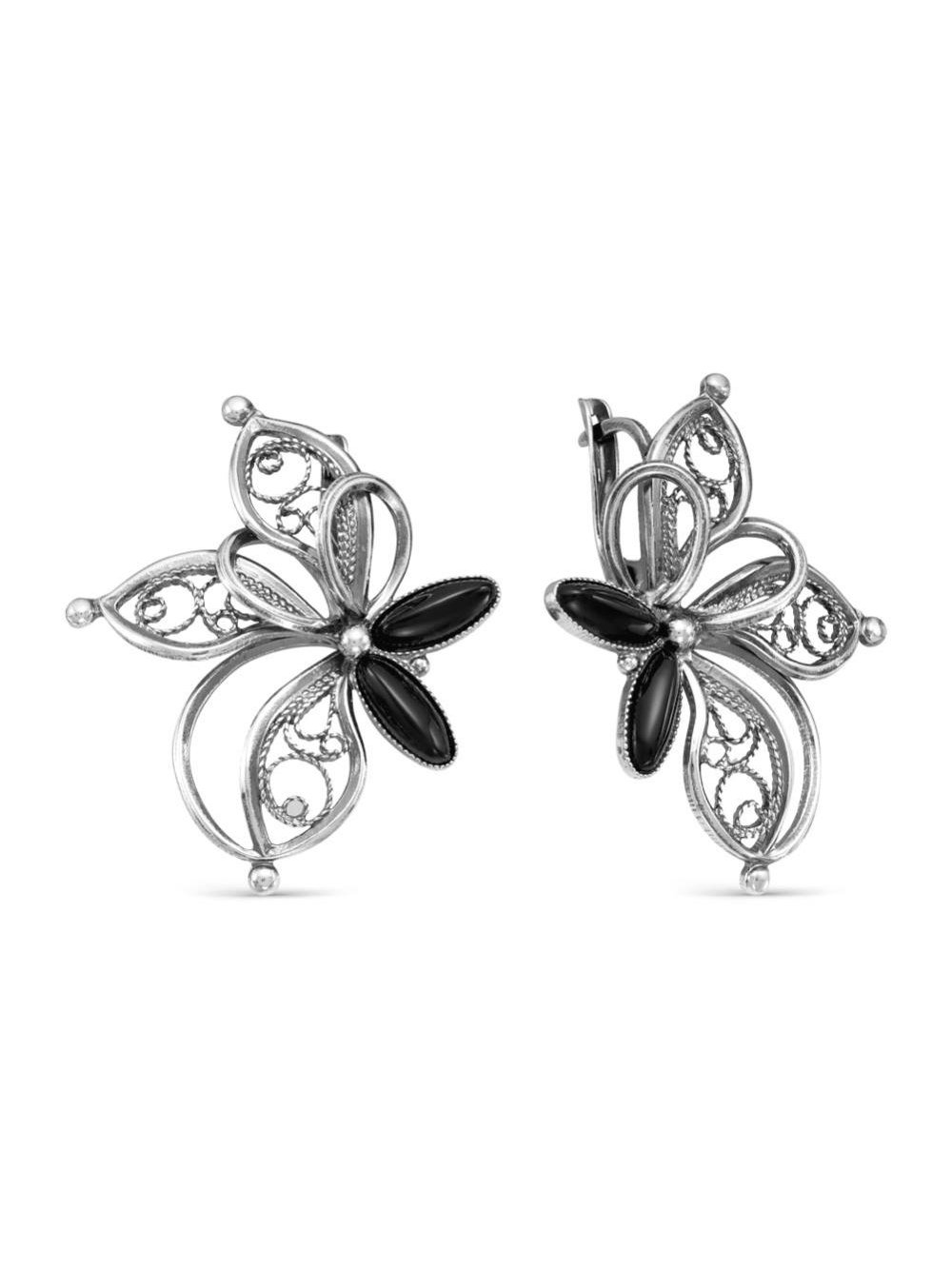 Серьги бижутерия, покрытие - серебрение с оксидированием, вставка - искусственный агат черный