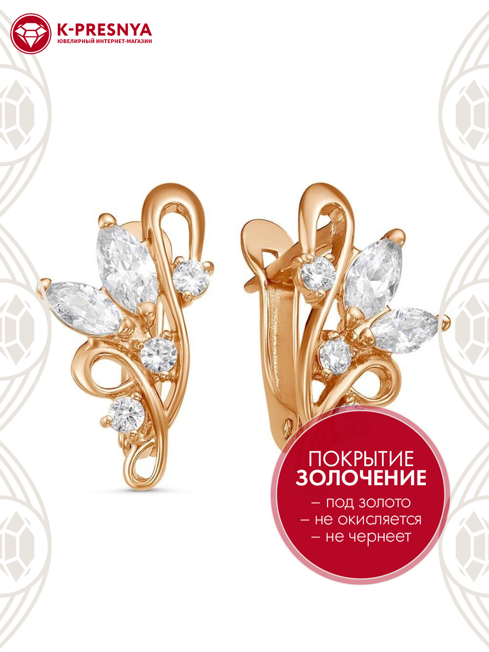 Серьги бижутерия, покрытие - золочение, вставка - фианит (недрагоценный камень)
