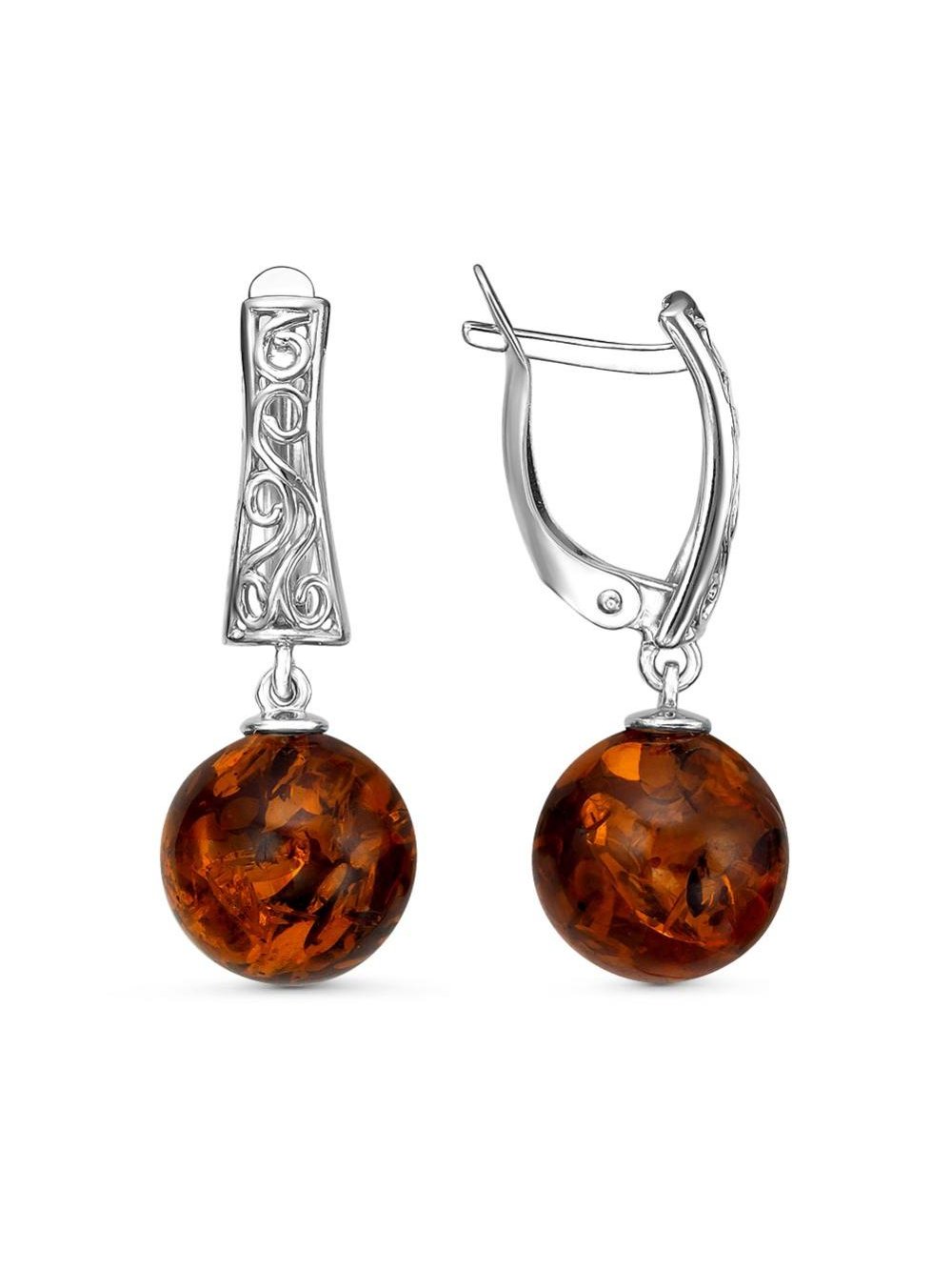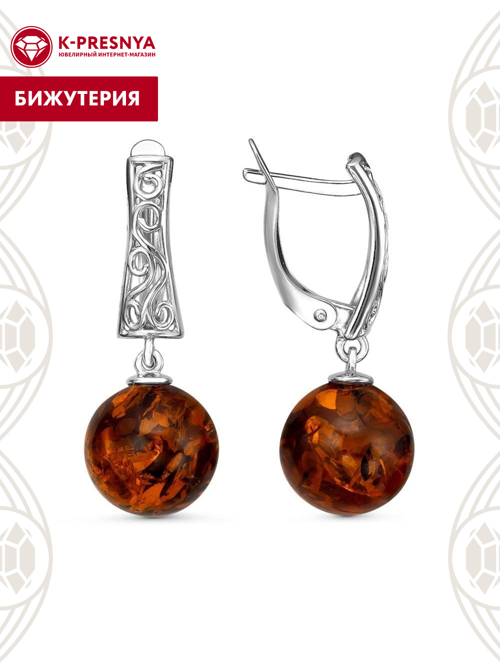 Серьги бижутерия, покрытие - серебрение с оксидированием, вставка - искусственный янтарь
