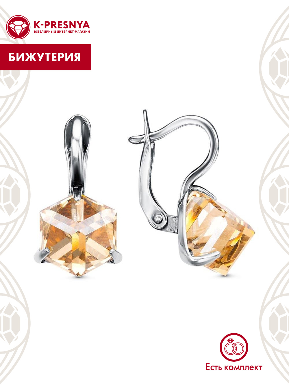 Серьги бижутерия, покрытие - серебрение с оксидированием, вставка - ювелирное стекло европейской огранки
