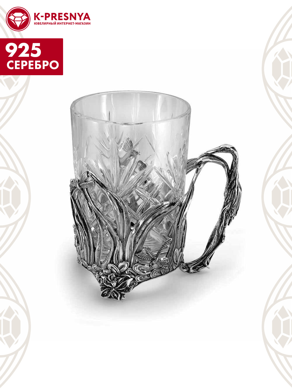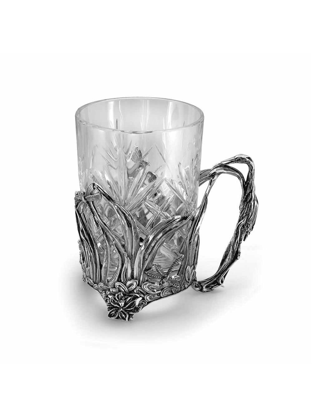 Подстаканник выполнен из серебра 925°. Он украшен прекрасным пейзажем, иллюстрирующим живую природу, на котором изображены стрекозы, цветы. Ручка выполнена в виде цапли. Он привнесет в дом неповторимый колорит и добавит нотку изысканности церемонии чаепития.