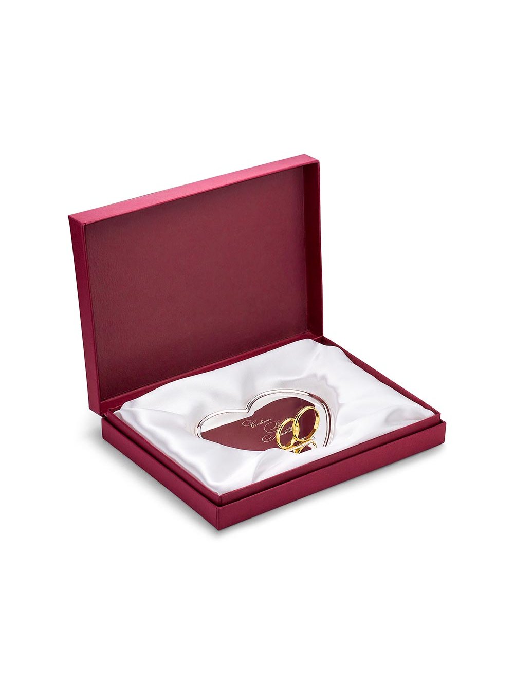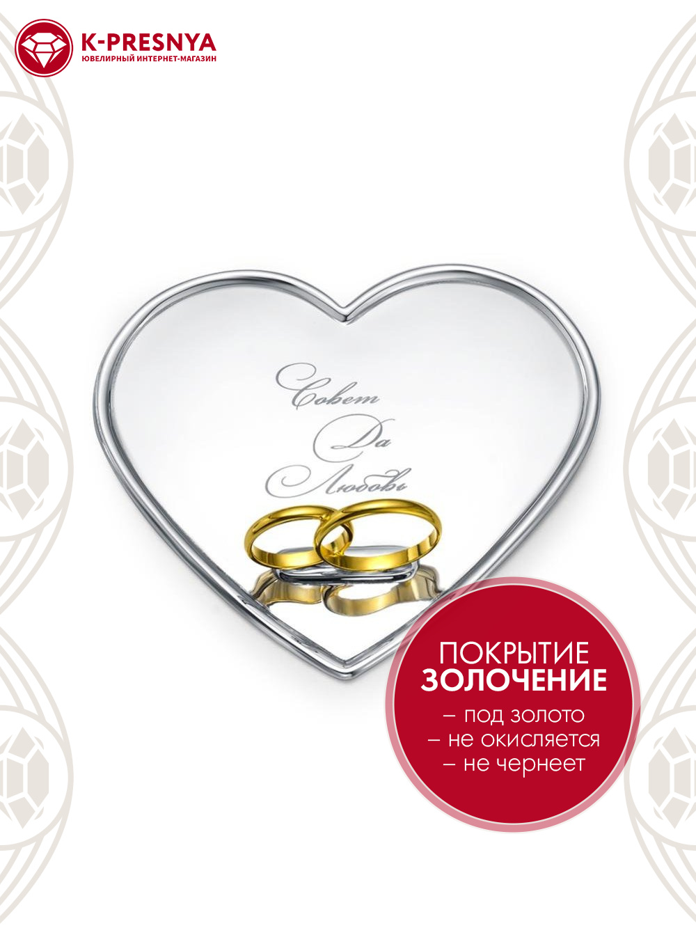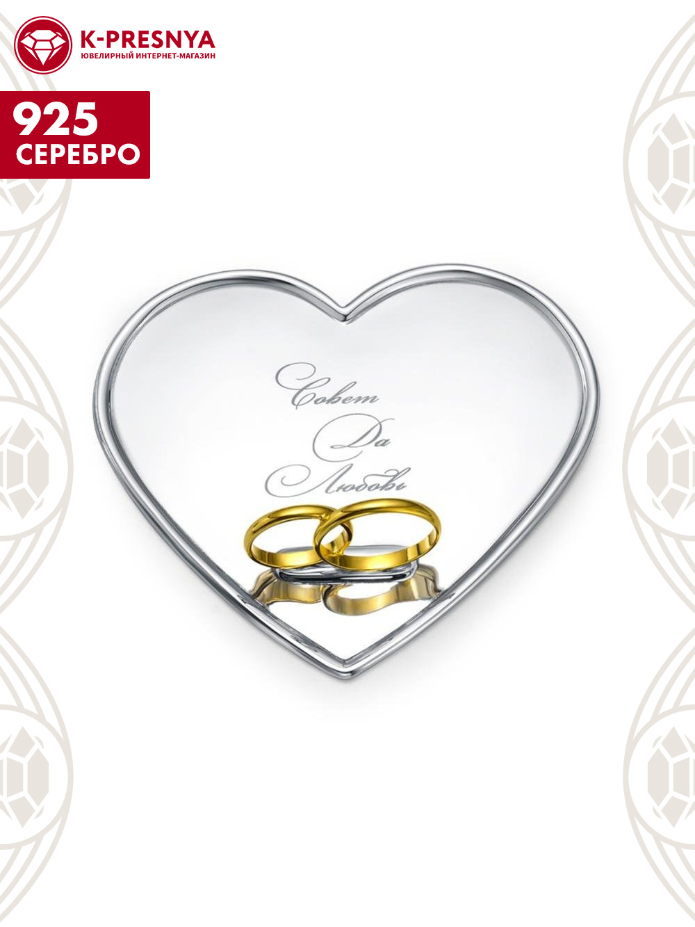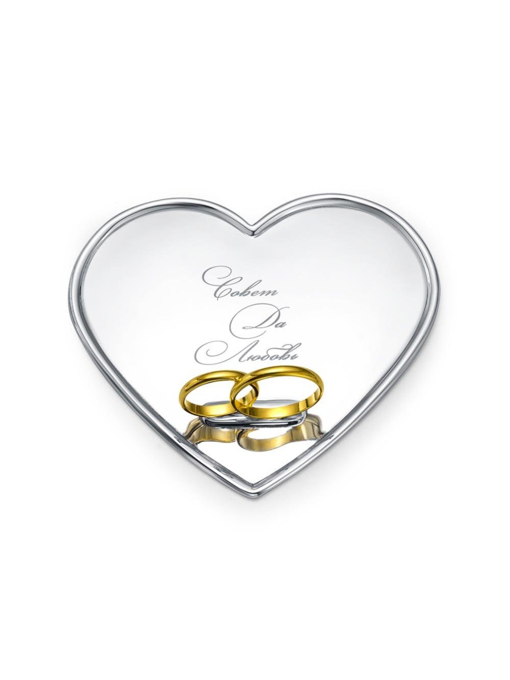 Серебряный, зеркально отполированный поднос в виде сердца с двумя позолоченными кольцами выполнен специально для молодоженов. Изюминка сувенира — изящная надпись «Совет Да Любовь», нанесенная лазерной гравировкой. Такой поднос станет не только неотъемлемой частью торжества, но и отличным подарком для жениха и невесты.