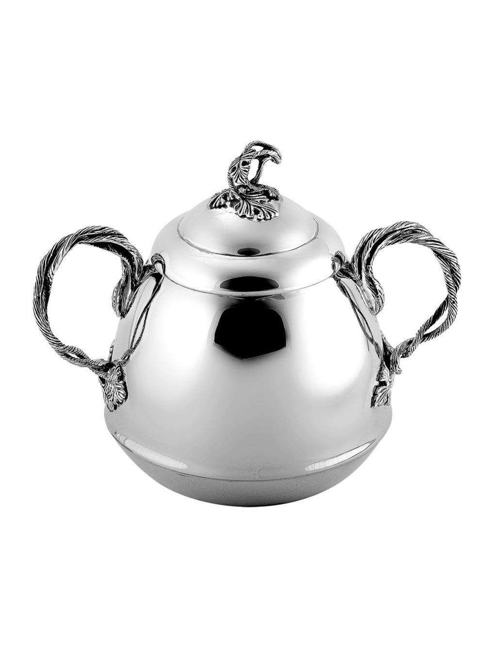 Идеально гладкая сахарница выполнена из серебра 925°. Она имеет простой лаконичный дизайн, с красивыми ручками выполненными в виде виноградной лозы. Поверхность ее отполирована вручную, что придает изделию невероятный блеск. Сахарница идеально дополнит сервировку вашего стола при семейном чаепитии.