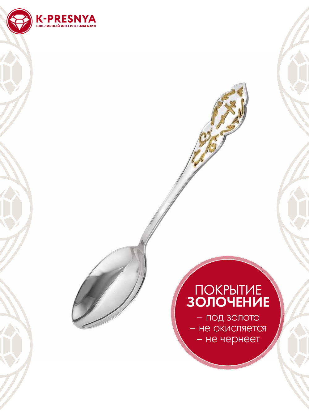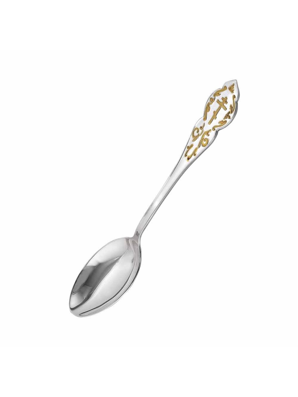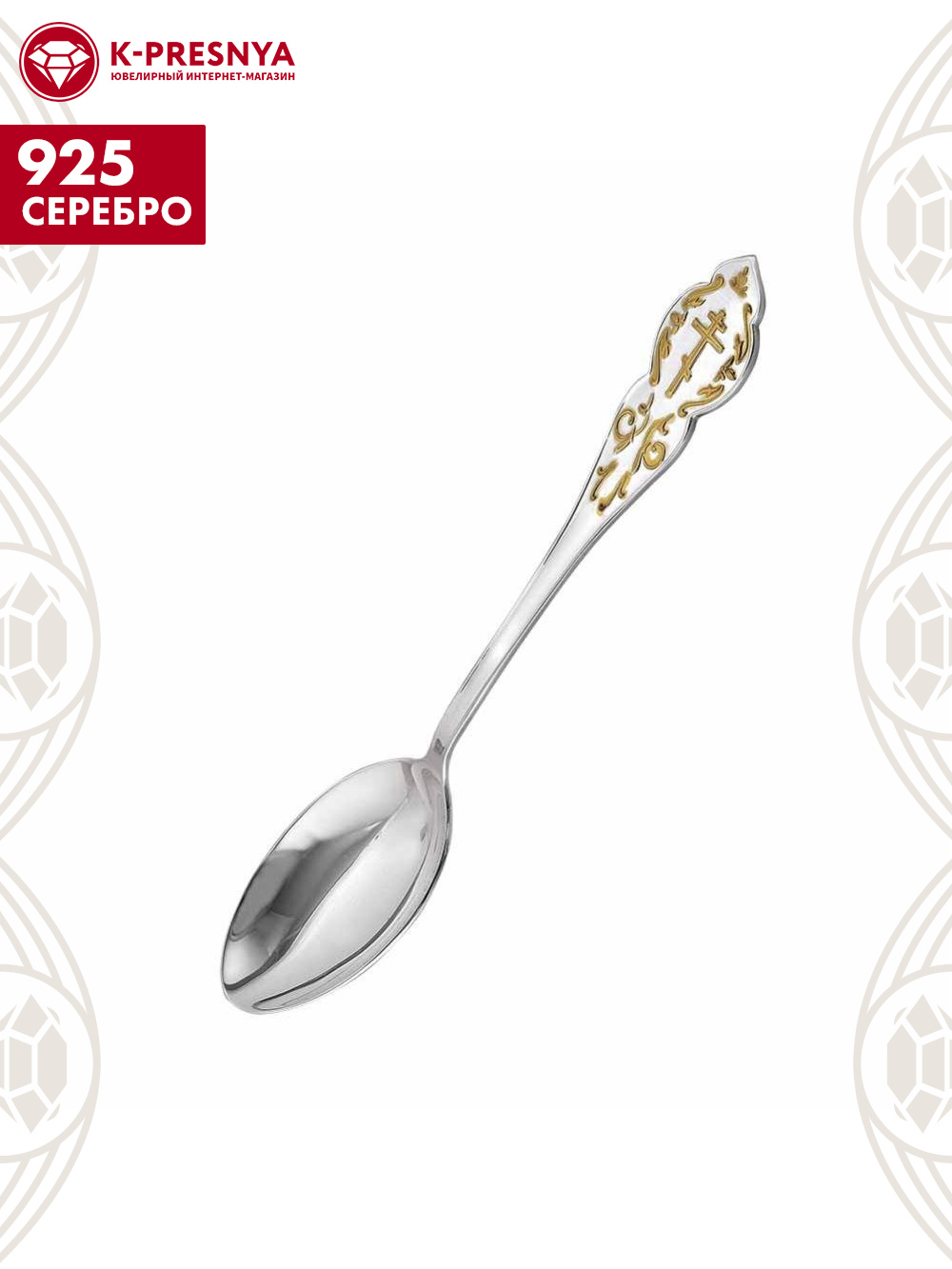 Аккуратная и удобная ложка выполнена из серебра 925°. Изысканный дизайн, с красивым позолоченным узором и символичным изображением «Креста» на черенке, станет оригинальным подарком на крестины.