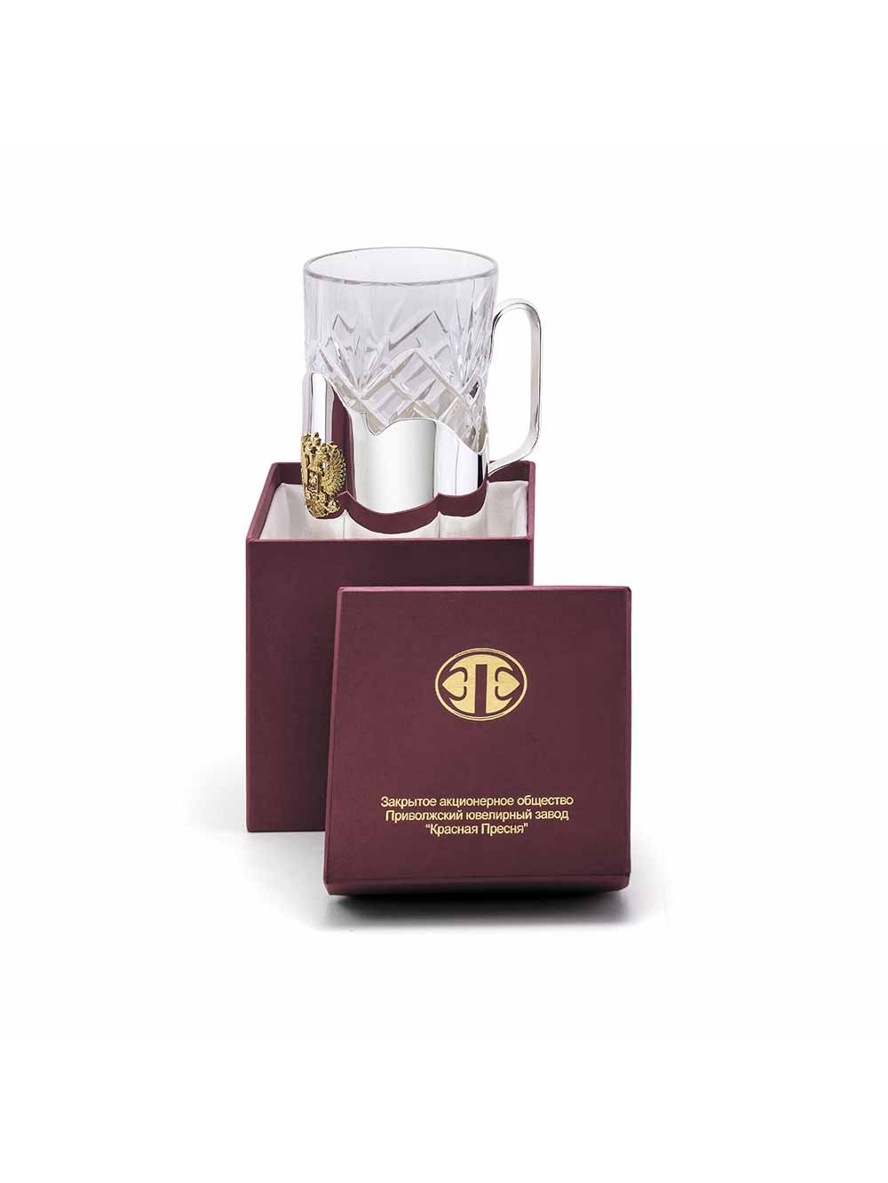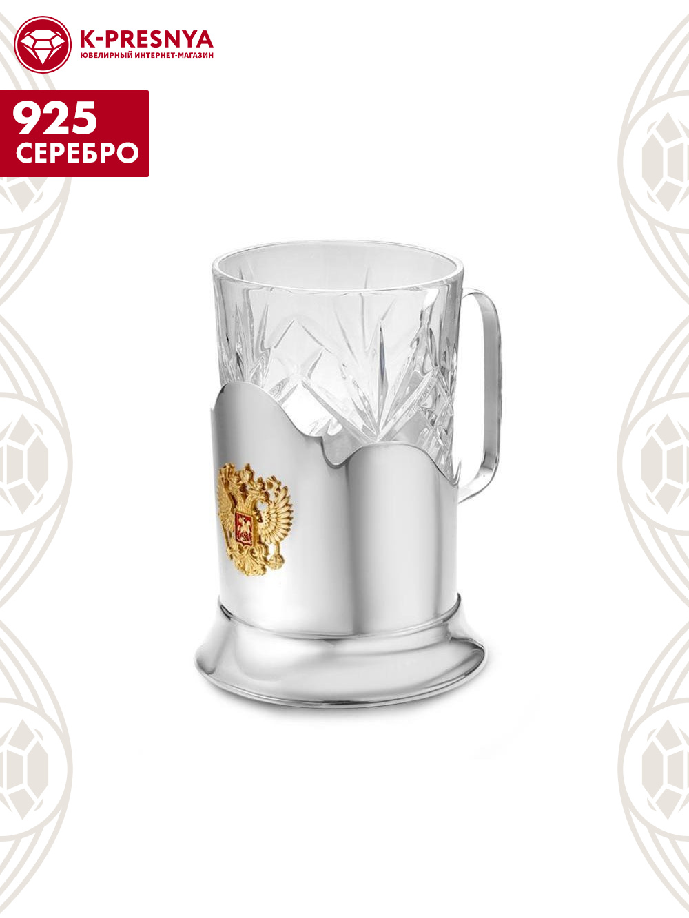 Подстаканник выполнен из благородного металла. На нем расположен позолоченный двуглавый орел, который символизирует единство и суверенитет России. На его груди находится красный щит, декорированный итальянской красной эмалью, в центре которого расположен серебряный всадник.