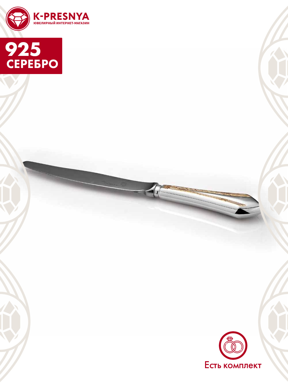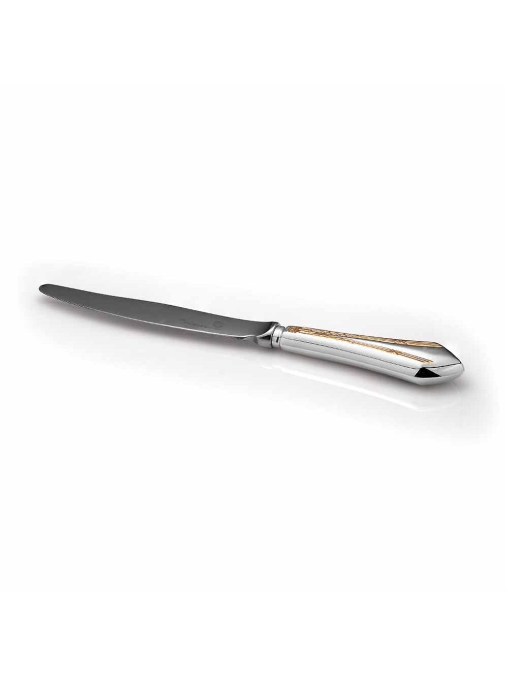 Идеально гладкий нож с отполированной поверхностью и плавно закругленным лаконичным лезвием. Ручка ножа выполнена из серебра 925°и декорирована позолоченным узором. Лезвие изготовлено из высокопрочной нержавеющей стали.