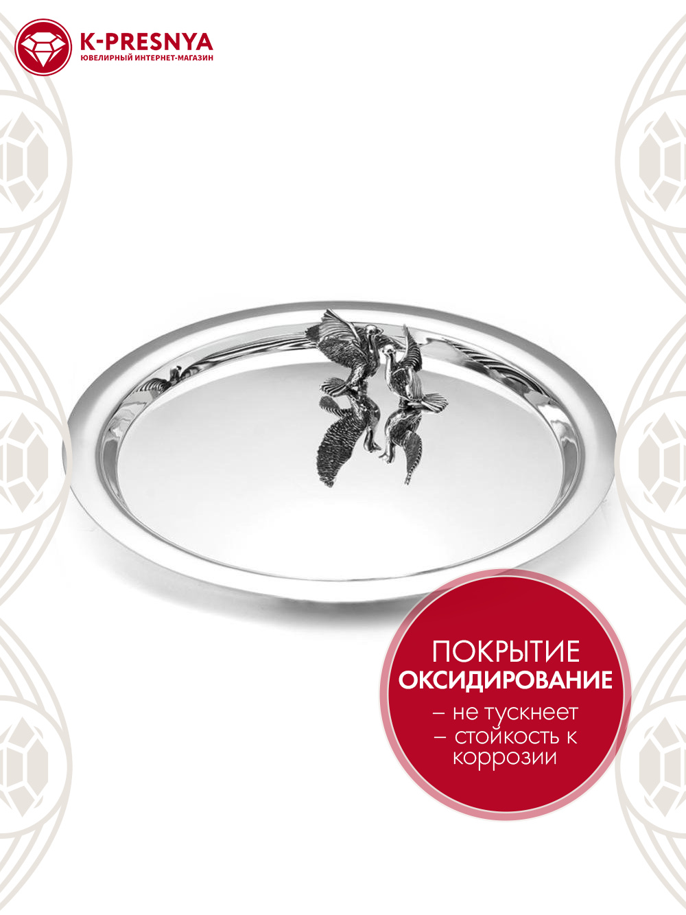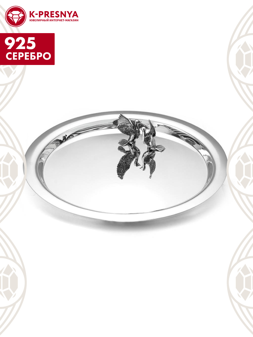 Поднос "с голубями" серебро 925 пробы, покрытие - оксидирование, без вставок