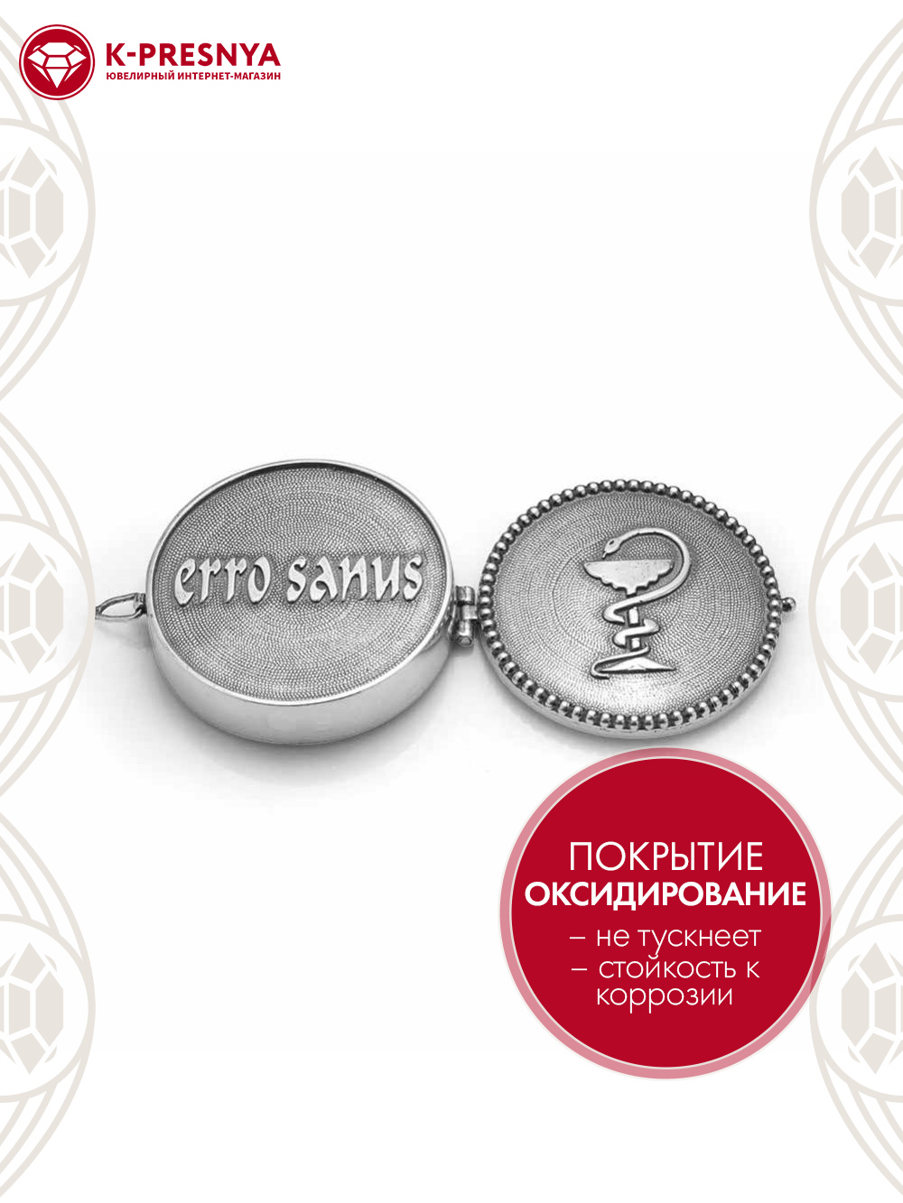 Серебряная таблетница с надписью erro sanus, что в переводе с латинского означает "Во благо здоровья"